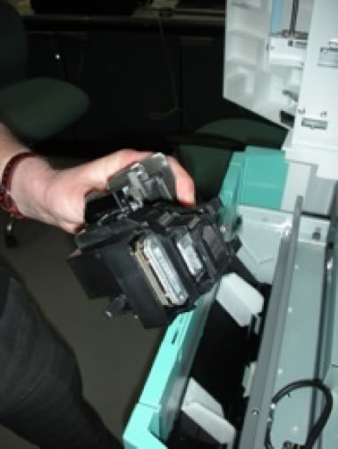 Just like the dry lab’s “wet” predecessors, there is a small device that prints on the back of each print. This has a typewriter-style fabric ink ribbon through which it prints lines of dot-matrix characters. This ribbon winds back and forth and eventually gets used up - signalled by the back-print getting faint. Renewing the ribbon is a simple matter of unclipping the printer module and changing the small cartridge.