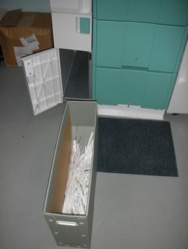 Less regularly is emptying the chaff bin. Chaff is the thin strips of paper that are left over when the lab cuts the trailing end off one print followed by the leading end of the next. These fall in to a *huge* bin stored beneath the ink cartridges. It is probably a good idea to make it a monthly or six-week task to check this because it takes so long to fill up you could easily forget about it altogether.